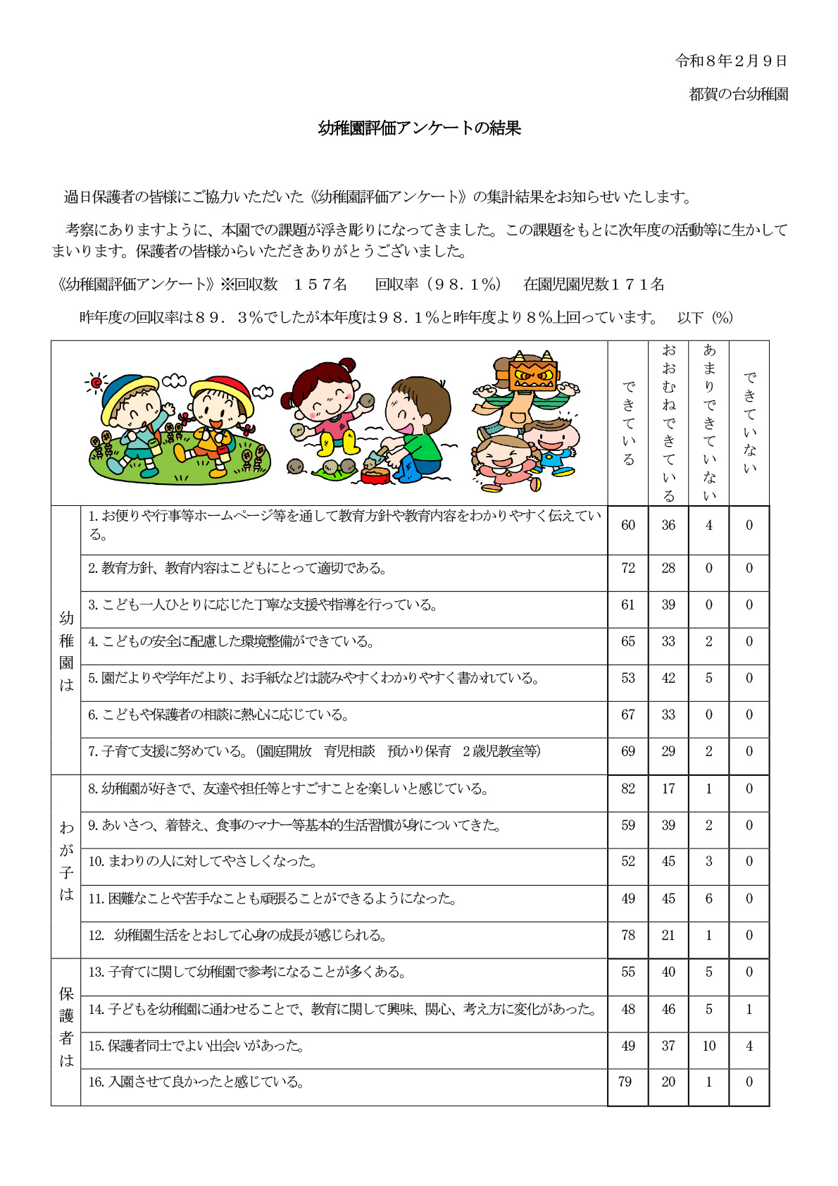 都賀の台幼稚園園児171人中、159名の保護者の皆様から回答をいただきました。