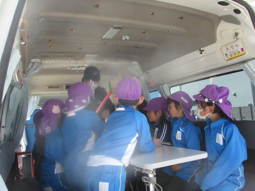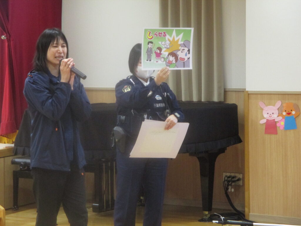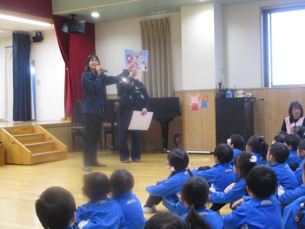 園の様子 防犯訓練がありました 2026-02-19 千葉東警察署、生活安全課の皆様が来てくださり防犯訓練を行いました。 放送で子どもたちは教室の隅やトイレの方に隠れました。 不審者が取り押さえられた後は、ホールで「いかのおすし」の話を聞きました。 知らない人についていかない、知らない人の車にのらない、危険を感じたらおおごえを出す、その場からすぐ逃げる、大人の人にしらせる ・・・ご家庭で確認をお願いします。 移動交番も来てくださいました。車の中に入り「誘導棒」や「さすまた」を見せていただきました。 前 1月の様子 最近 チャレンジ こちらもおすすめ 保護中: 園内探検! 2025-08-29 保護中: 枝豆を収穫しました(さくら組) 2024-10-24 保護中: 年長さん最後の運動会 2025-10-03